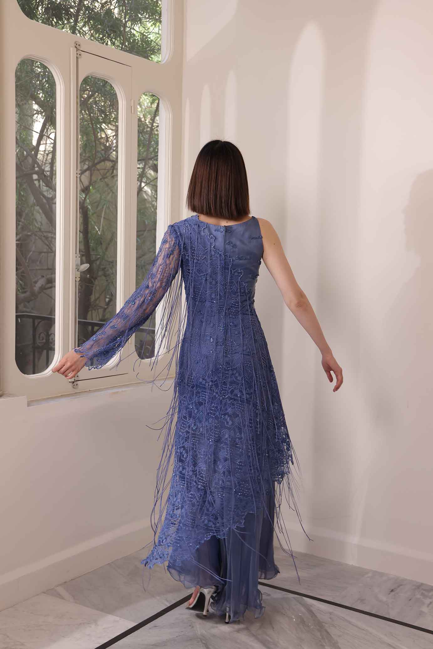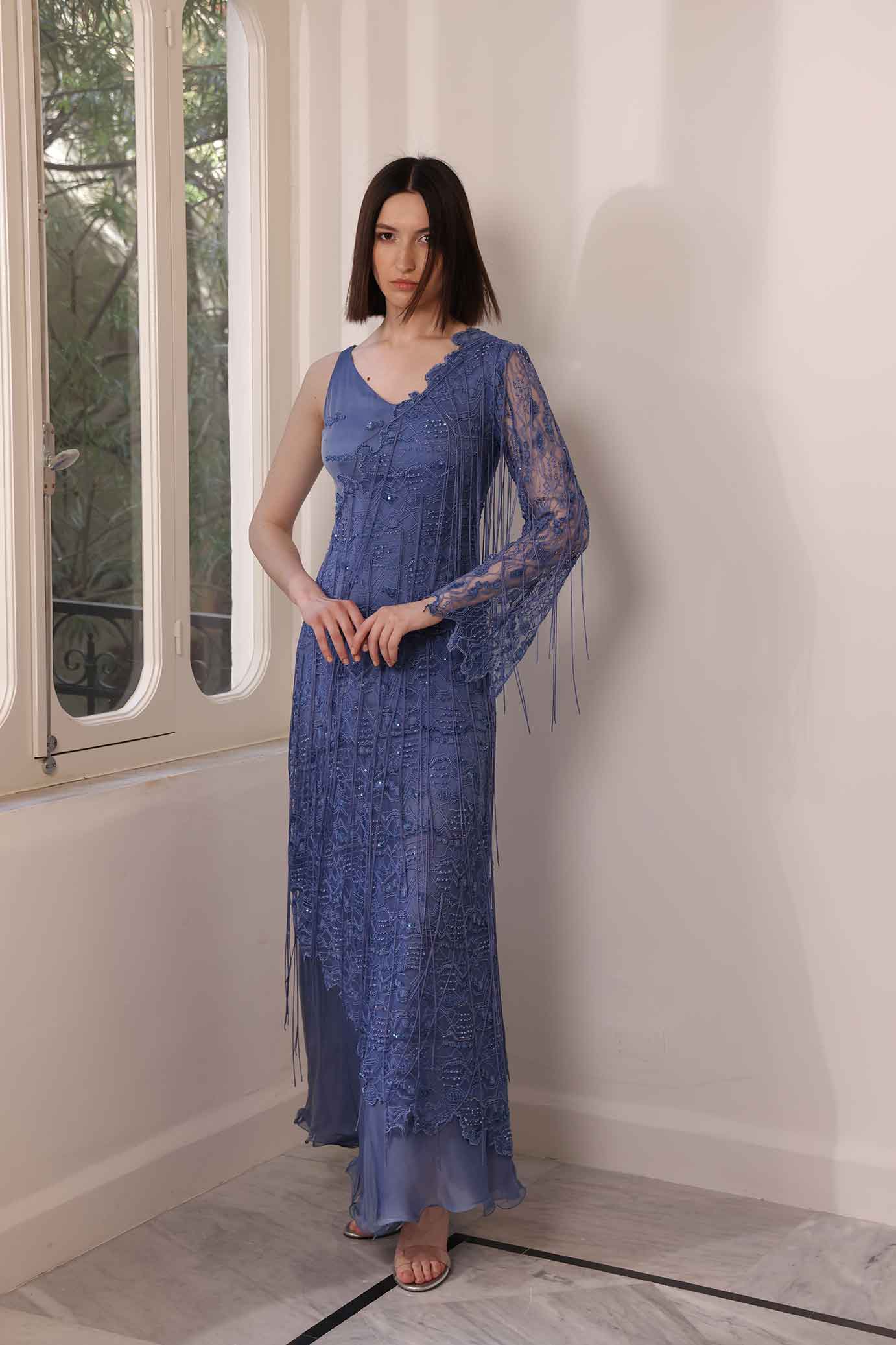 Long silk muslin blue dress with emboidered lace.