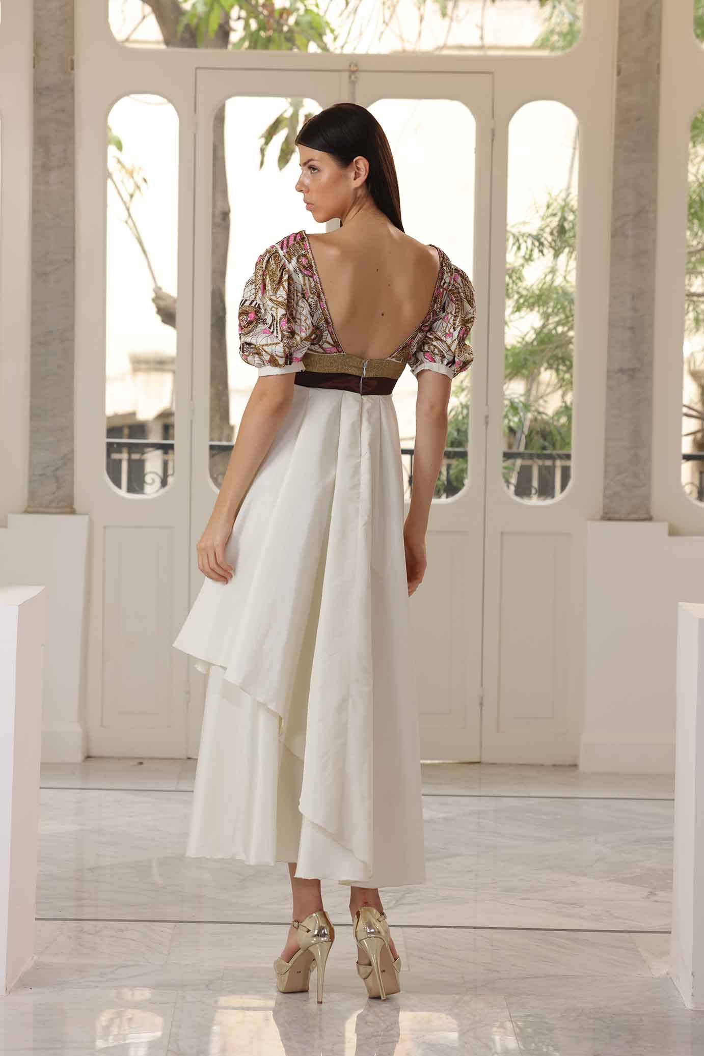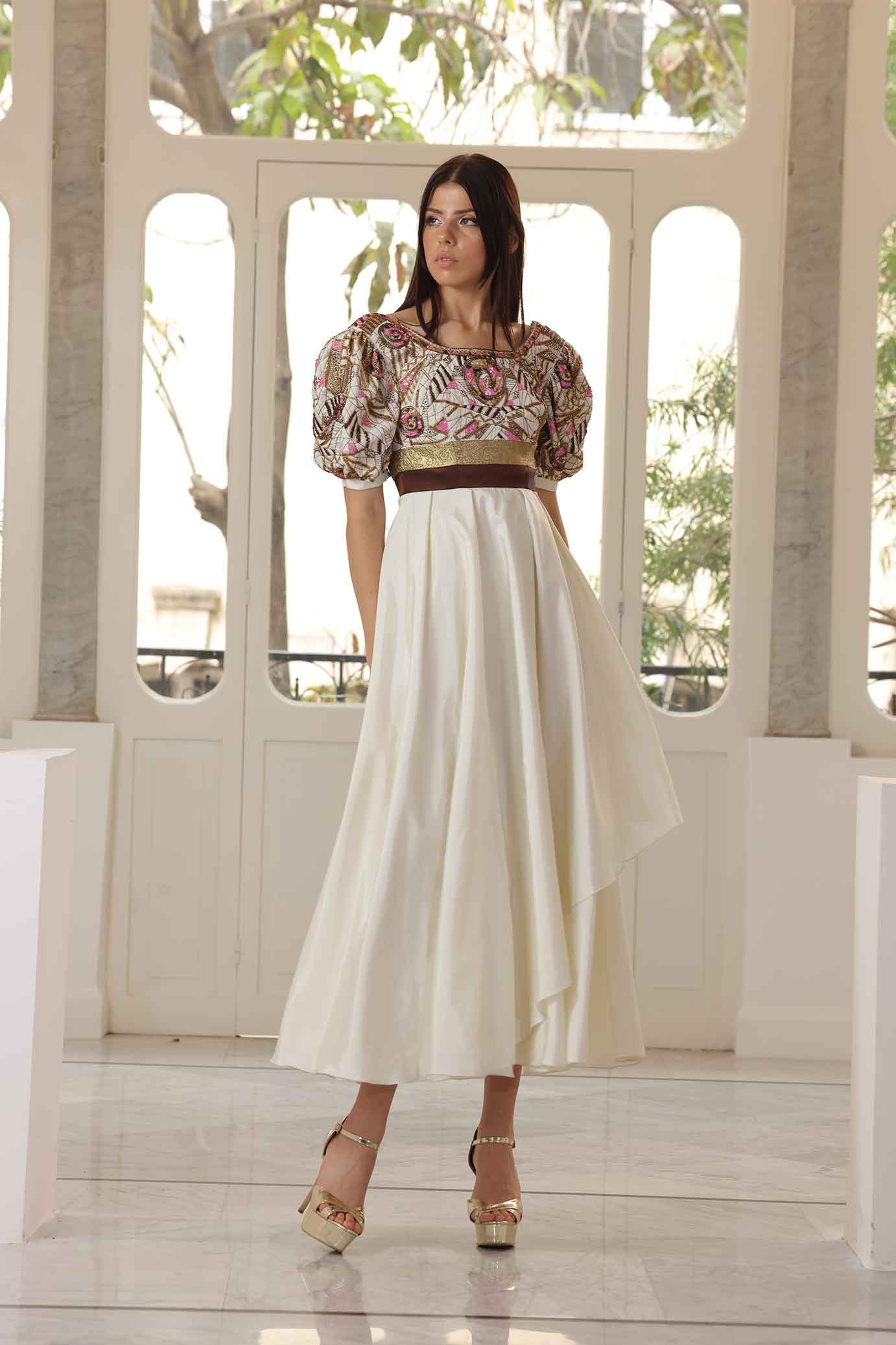 Ankle length off-white taffetas with bronze embroidered bust and sleeves.